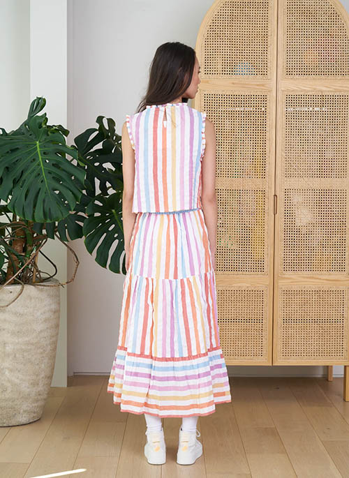Cut in a Rainbow Stripe cotton fabrication, the tea-length Maya Skirt features contrast-tiered skirt details and sits just below your true waist. Pair this piece with the Aviana Tank for that chic, twin-set ensemble.