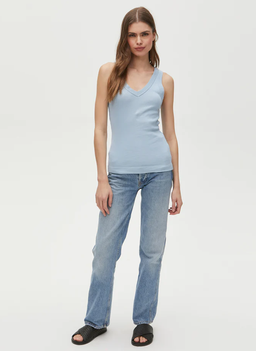 Lightweight and goes with everything. Maya has a wide binding v-neck with a fitted silhouette and is made from 100% cotton.
