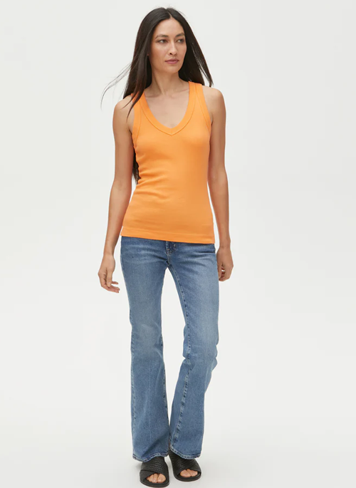 Lightweight and goes with everything. Maya has a wide binding v-neck with a fitted silhouette and is made from 100% cotton.