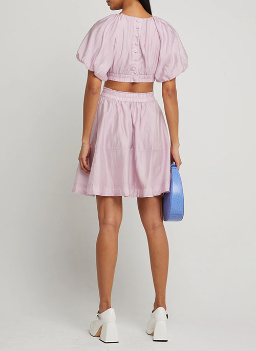 This unique dress creates a flattering silhouette with cut out waist details and billowy sleeves. Finished with back buttons and a floart skirt.