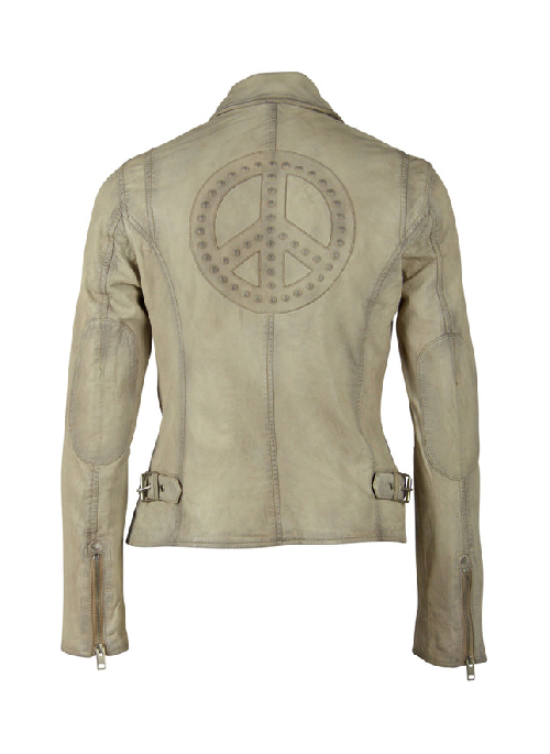 Fine peace in good style! Keep it classic in this 100% vegetable-tanned, lambskin lather jacket. Clean lines, front-zip style details on the shoulders and upper back. Featuring a 'Peace' sign on the back.
