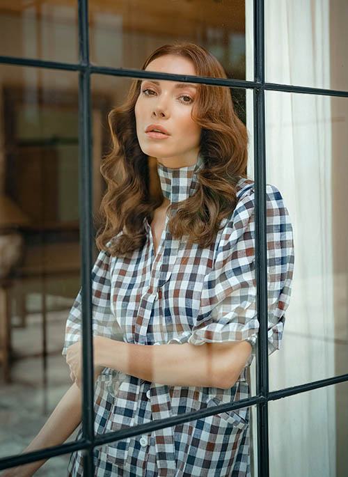This charming Gingham midi dress is crafted from a linen cotton fabric featuring an elegant V-neck, removable knot fabric belt, and balloon sleeves. Style yours with matching neck twilly and your favorite summer espadrilles.