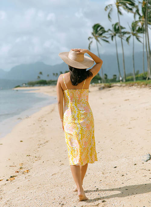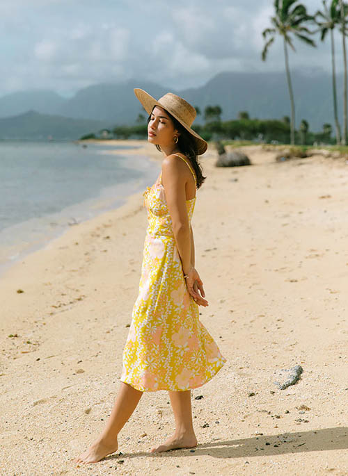 The Mele Dress features a delicate tie, ruched bust, and seams below the bust and across the waist. The silhouette feels vintage and feminine - perfect for picnics and days by the beach.