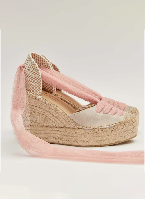 Pink espadrille with green tulle. It is a very comfortable, fresh and summery 7-string sandal. Perfect to give a boho touch to your spring and summer looks.