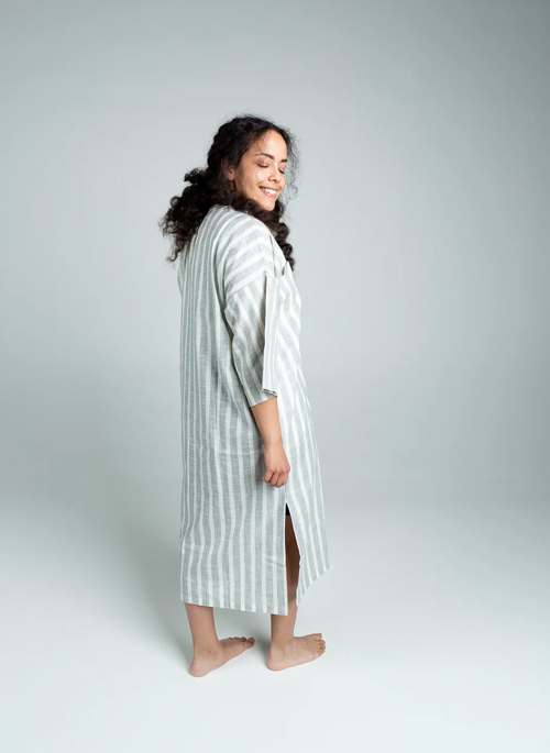 Roomy but with some chic- this stylish kaftan is great for around the house, post sauna, or heading to the beach. The fabric is all handwoven so it’s got some texture and feel. This only gets better with use, the material gets softer after washings. It’s free size so works well with many shapes.  Enjoy!