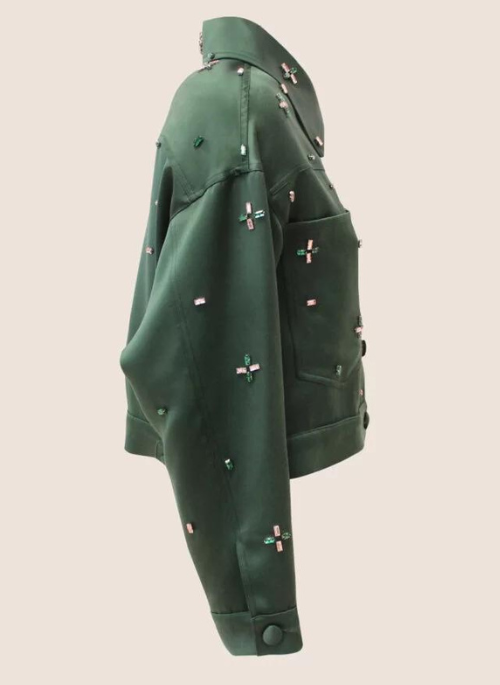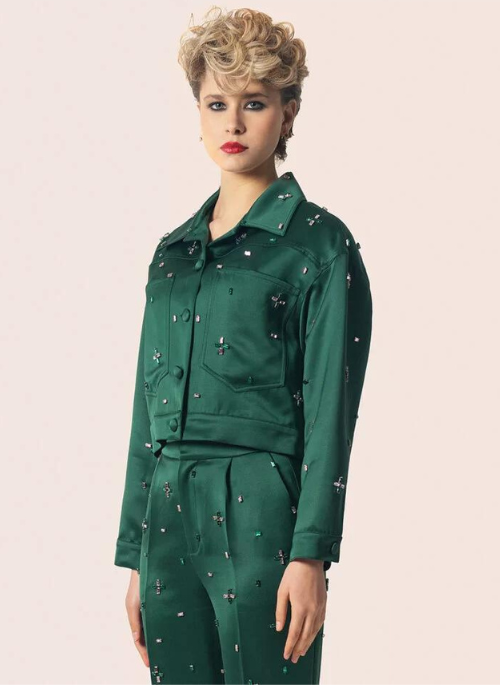 Short green jacket in wool and silk blend with shirt collar and two front pockets. Enriched with hand-embroidered baguette stones.