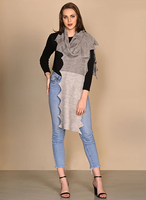 A classic yet unique dual color Dk. Grey and Lt. Grey melangeåÊscarf knitted from a very soft fine wool. The zig zag shape adds character to this unisex muffler whilst keeping you snuggly warm around the neck.