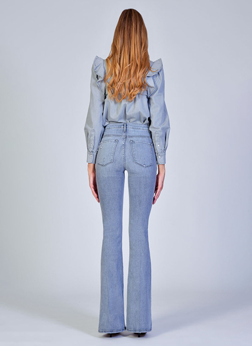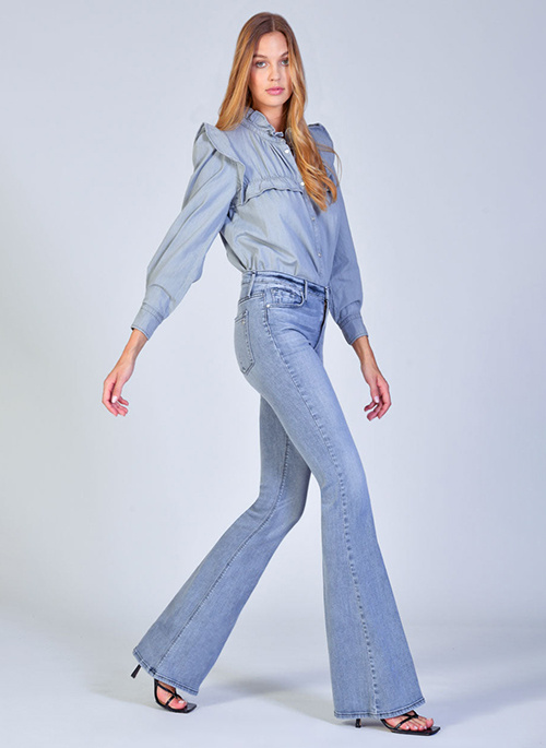 Our Mia is tapered at the knee and has a classic flare leg opening that delivers a sophisticated and chic vibe. Midnight Orchid is a light grey wash.