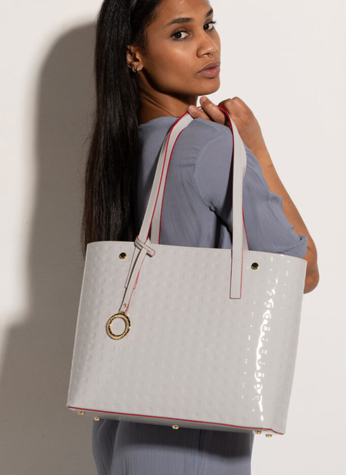 The Arcadia Miami is a patent leather bag embossed with our logo. It is a roomy and functional tote perfect for your daily outfits. This lady bag has long and flats handles to be more comfortable when worn on the shoulder. Two inner zip pockets on top will help you to contain your essentials.