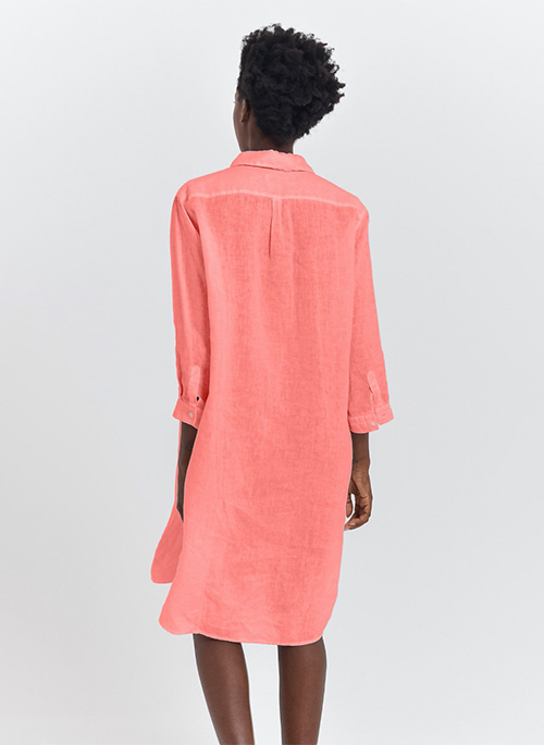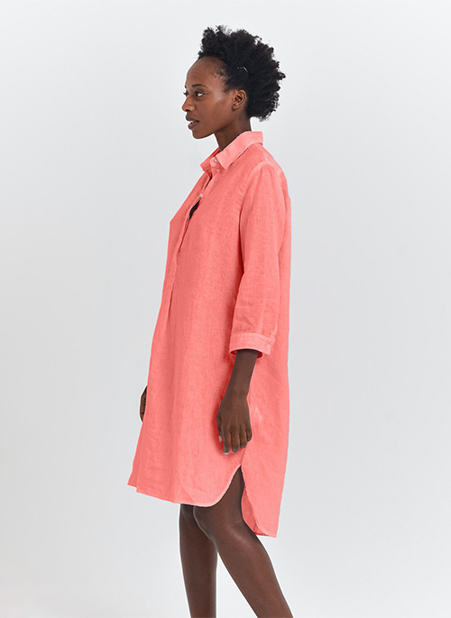 Mid length linen shirt dress designed in linen fabrication featuring breathability and lightness.