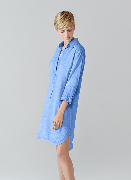 Mid length linen shirt dress designed in linen fabrication featuring breathability and lightness.