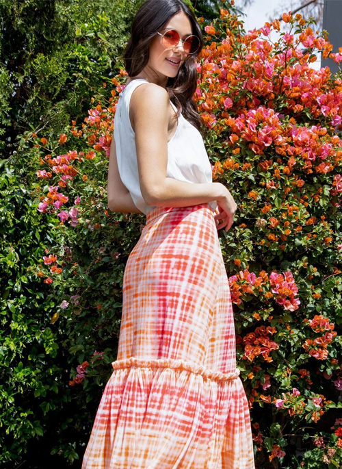 Standout this Spring and Summer in our best selling midi skirt silhouette in an all new vibrant orange and red sorbet printed plaid! The layered, lightweight mesh fabric is soft, stretchy and airy!Details: