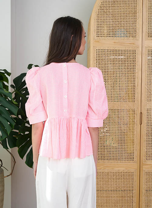 Sweet and simple, the Mien top is outfitted in ivory and Neon Pink Stripe print. Featuring 3/4 length puff sleeve design with contrast directional stripe and topped off with pin tuck bodice detail, this boxy fit peplum blouse is the perfect spring-weather essential with a timeless touch.