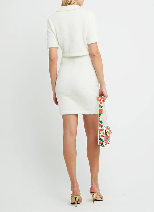 Super fuzzy, super cool. This soft set is done in a fluffy white knit and finished with pretty pearl buttons.