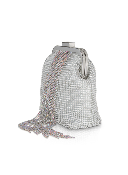 Behold the Mila Crystal Pouch—an exquisite accessory that exudes opulence and grandeur. Embellished with a plethora of glistening crystals, this pouch is a sight to behold as it shimmers and sparkles with every movement. Adding to its allure, the intricate crystal fringe adds a playful and charming touch, creating a dazzling visual display that is sure to captivate the senses.