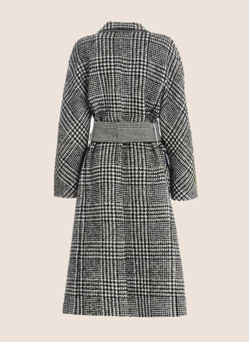 Long coat with a robe line in tweed with check pattern and wide rever collar. Characterized by kimono sleeves and moth-shaped patch application, designed and made by hand. The breast pocket and the two flap pockets are finished with purple piping. Enriched by the slit in the center on the back, the doubleface belt to tie at the waist and the fluorescent yellow fabric insert in the seams on the cuffs. Head designed and made entirely in Italy.