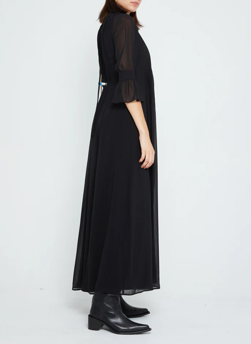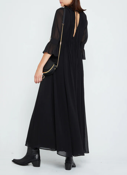 Lined and pleated chiffon creates this drapey dress. Done with a flattering, cinched waist and plunging V-neck line.