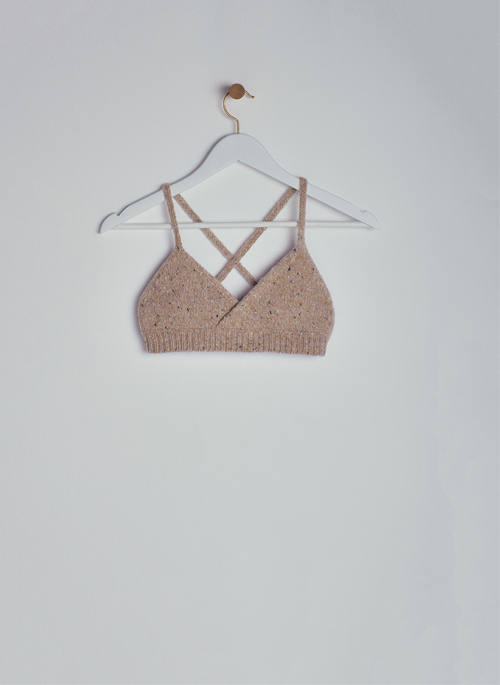 Rustic knitted wool bralette. Fine straps with crossed back. Ribbed hem detail finish. Crossed cuffs. Used sustainable yarn which is a blend extra fine merino wool certified by Responsible Wool Standard (RWS), Alpaca wool and Recycled Nylon.