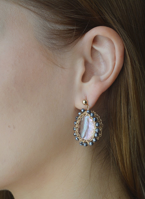 The lace-liked dangling earrings have been constructed artfully with crocheted 14K recycled gold-filled wire and playfully strung dozen mini faceted Terhertz stones round a lustrous purple baroque freshwater pearl. Terahertz stone represents the ‘Radiation of Life’. It has understated elegance, and marries well with any occasion and outfit.