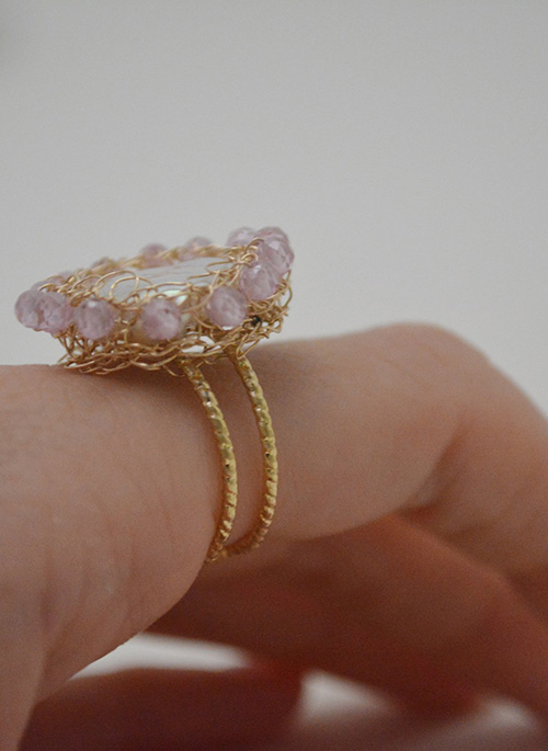 The lace-liked delicate ring has been constructed artfully with crocheted 14K recycled gold-filled wire and playfully strung dozen of mini soft pink cubic zirconia stones around a lustrous classic white baroque freshwater pearl.