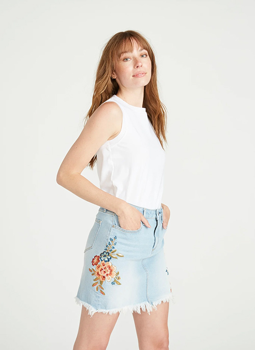 Maui wowie! This light wash, frayed mini skirt is striking, with its colorful orange, red and blue embroidery on the sidesDetails: