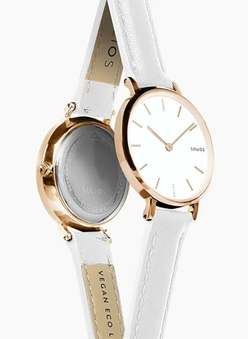 The Solios Mini Solar Watch perfectly combines aesthetic, green technology, and durable materials. The 6.5mm thin Rose Gold colored 316L stainless steel case is topped by a White dial with a minimalist style and offers a water-resistance of 3 ATM. The hardened mineral glass is covered with a robust sapphire crystal to limit scratches. At the heart, a solar cell allows the watch to recharge by itself and offers a 6-month energy reserve. In addition to promoting slow fashion with style, you'll never have to change your battery.