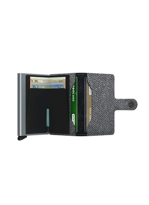 Small in size and surprisingly large in storage capacity, the Miniwallet combines the best of both worlds. The exterior holds banknotes, receipt and cards, while the aluminum Cardprotector allows you to slide out cards with one simple motion and protects them from bending, breaking, and unwanted wireless communication.