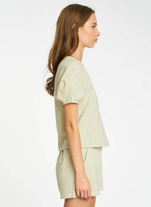 With its puff sleeve and relaxed fit, the Mojito Top is easy and versatile in equal measure. Cut in a Green/Ivory stripe knit, this shirt is finished with abbreviated sleeves for a stylish, youthful look. Pair this top with the Benson shorts for that perfect twin-set, luxe look.