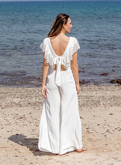 With its beautiful and peacock inspired broderie anglaise ruffles, fine pintuck details at waist and wide legs, MORNING PAUSE is the ultimate jumpsuit for the season. Feminine and cool at the same time. Pay attention to the beautiful cut at the back and flirty tie strings.