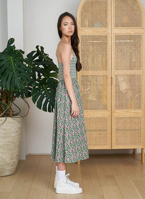 With its A-line midi-length hem and smocked bodice, this Moss dress is cut in a spring-inspired Green Block print. Dainty adjustable straps give this style an organic springtime aesthetic. A classic dress that can easily take you from desk to drinks.