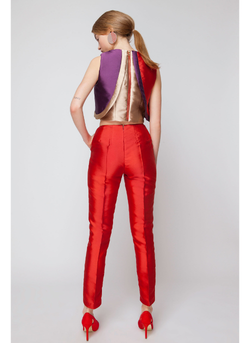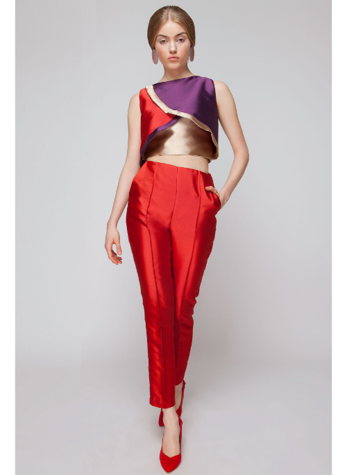A stylish multicolored cropped top to add a few futuristic vibes, based on the super stylish overlapping layering effect. A rich in texture cropped top that combines different layers of the same quality fabric, designed with the technique of artful layering. It features a slim fit and a colorblocked pattern. Pair it with its matching cigarette pants to create a stylish summer outfit. The cropped top belongs to the "Chromocracy" SS Collection, chroma being the greek word for colour.