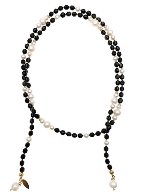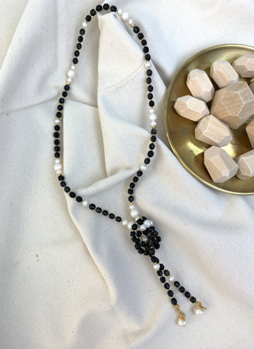 This open ended necklace features black obsidian with freshwater pearls with Japan golden plated brass findings. Wear it in multi-ways such as open ended or knotted to create your own style. Matching with blouse or midi dress looks gorgeous! Also, this is a very nice gift for birthday or anniversaries.