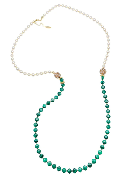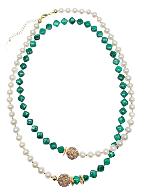This handmade multi-way necklace is made of freshwater pearls with malachite with rhinestones bordered pearls and Japan golden plated brass findings. It can be worn as single long necklace or double wrapped from day to night for any occasion. Style it your way and bring joy to your everyday. Also, this is a very nice gift for birthday, anniversaries or festivals. It will be contained in a nice jewelry box with well packed.