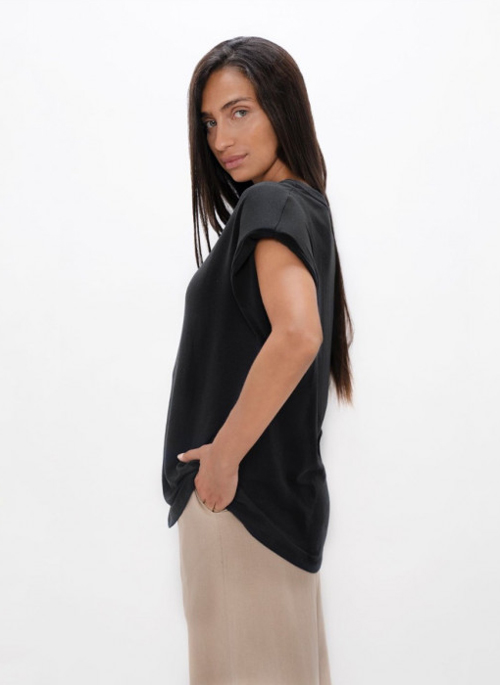 A dramatically designed staple T-shirt in a regular fit with playfully padded shoulders. Cut to an effortlessly relaxed silhouette complete with a ribbed crew neck border.