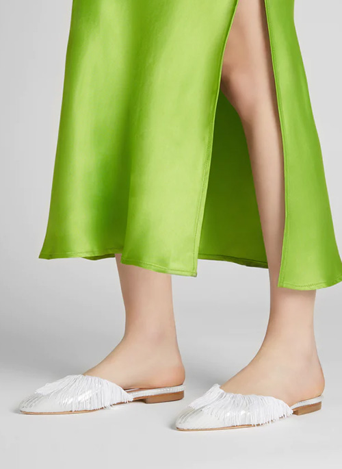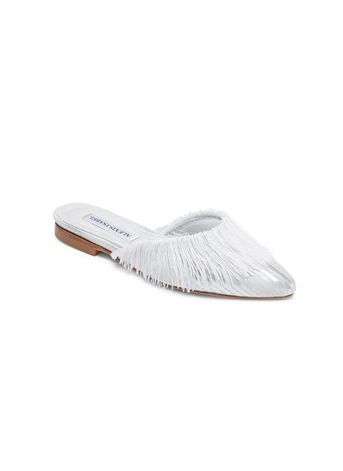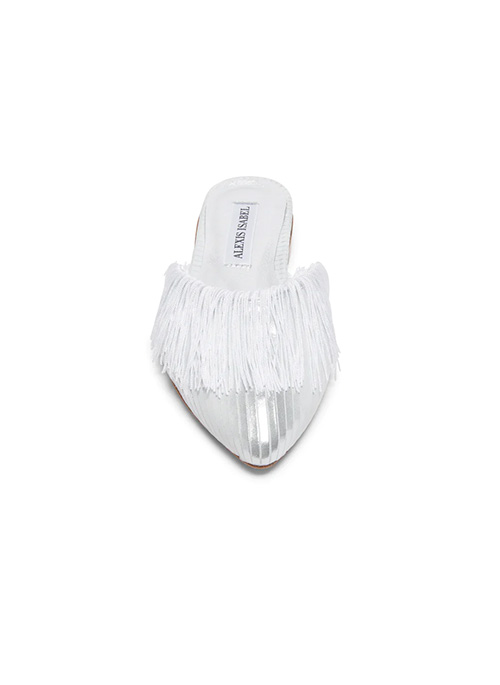 These mule slides are made with special white and silver pleated leather. A pointed toe makes them elegant. Fun white fringe accents the vamp. Brides slip these slides on to wear to the ceremony and the reception.