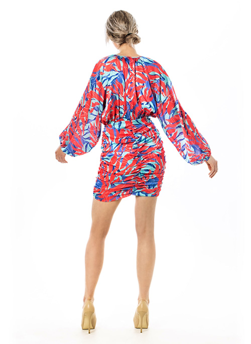 Mini dress made of light chiffon. The bottom of the dress is wrinkled strongly. Additional charm is added by wide sleeves finished with an elastic band. Fastened with a zipper at the back.