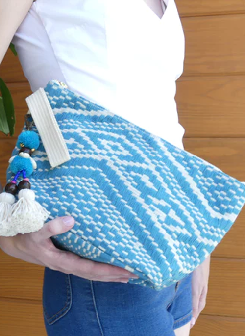 Handwoven tribal textile pouch features a cotton wristlet strap, beaded pom tassel, interior zip pocket and leather tab zip pull.