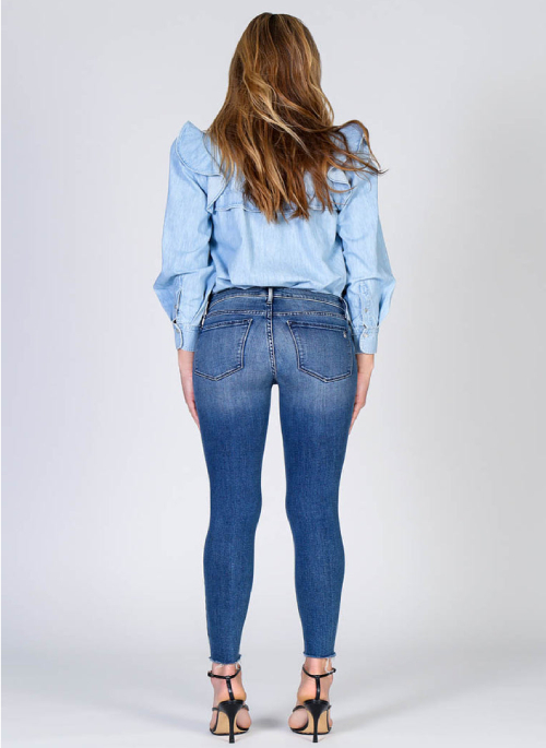 Our Noah Ankle Fray has a classic mid-rise with a frayed hem giving a laid-back vibe to the traditional skinny. A medium wash with hand sanding and whiskers at the thighs.