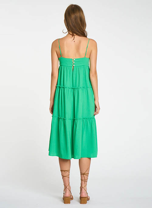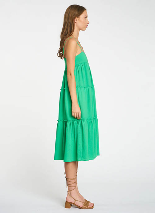 A youthful midi dress in a vibrant Green fabrication, the Noelle Dress features a subtle, tiered ruffle skirt and adjustable spaghetti straps. Cut in a cool, vibrant Green woven, this style offers a laid-back look of natural sophistication