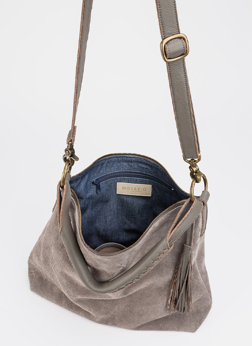 The Nomad is our classic style. A staple to your collection. You can wear as a shoulder bag or crossbody.  Flawless buttery leather. Classic laced-leather strap. The brass detailing and gorgeous leather fringe tassel on the zipper, give this purse it’s signature Molly G flavor.
