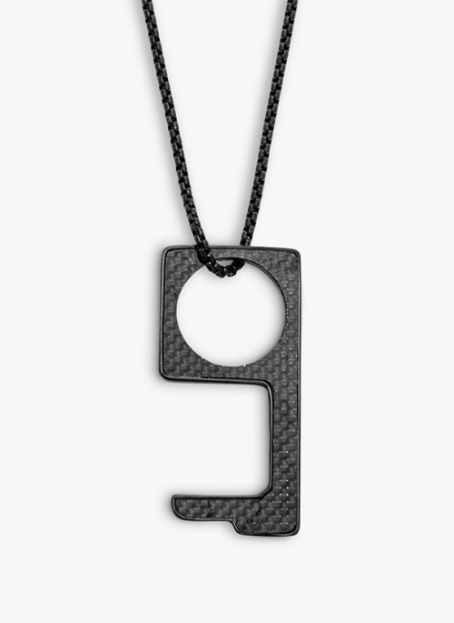 With the ever-increasing need for safety due to the COVID-19 pandemic this "non-contact" necklace has been designed with the modern gentleman in mind. This design combines form and function into an elegant and interesting necklace that can be used to open doors, push buttons and provide an extra barrier between yourself and the risk of infection. Set with an inlay of black carbon fibre or blue alutex this industrial design in made from black IP plated stainless steel and strung on a 32 inch chain.