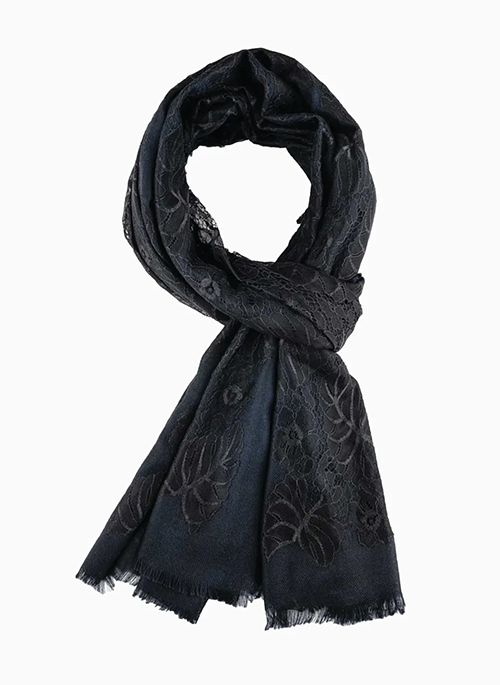 This black scarf is crafted from a very fine cashmere. It is a unique scarf that is double layered with a gossamer leaf-patterned lace in a tonal black colour and is finished with a wispy eyelash fringe. Unmistakingly stylish and comfortably warm, this accessory will turn heads.