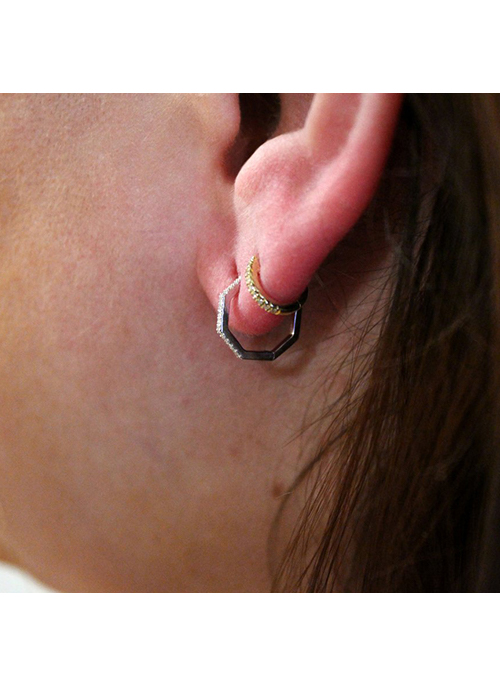The Octagon Huggy Earrings are the perfect geometric hoop to spice up your jewelry collection. They are set with small diamonds all along the front.
