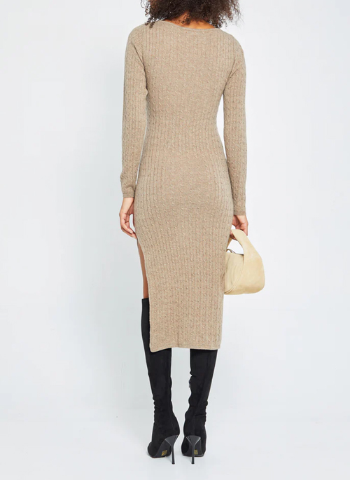 The Olga Cashmere Dress features a flattering, fitted silhouette and luxurious 100% cashmere fabric. It is designed with a square neckline, cable knit, and midi length hem with a side slit for added movement. Its soft and chic design ensures a timeless style for a variety of occasions.