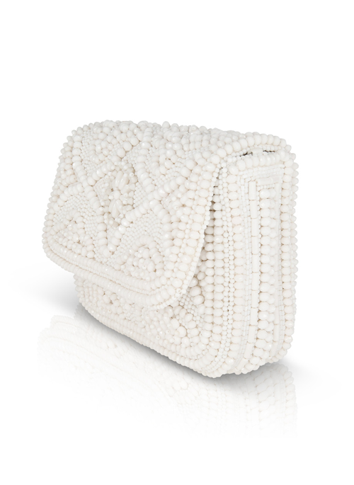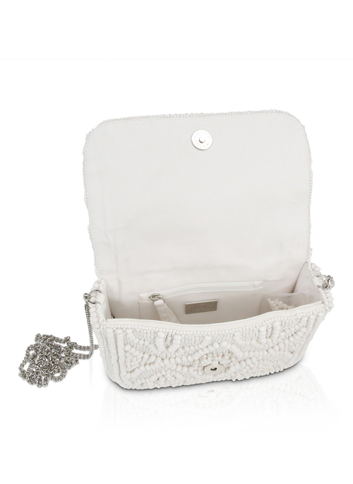 Elevate your look with the Olivia Crossbody, a stunning piece that flawlessly blends classic sophistication with contemporary design. This exquisite accessory showcases a breathtaking monochrome Portugal tile pattern that is entirely covered with delicate and shimmering beads, resulting in an utterly mesmerizing creation that can effortlessly complement any ensemble – day or night.