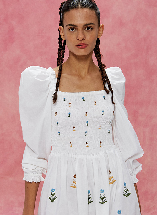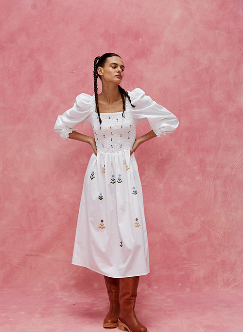 Contemporary midi dress in cotton poplin featuring an elasticated top with square neckline. The statement sleeves give a voluminous edge to this versatile piece, designed to take your from day to night. Hand embroidered ditsy flowers give an artisanal detail.