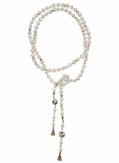 This multi-way necklace is made of freshwater pearls with rhinestones bordered tourmaline and Japanese gold plated brass findings. It can be worn with open ends or loose knots matching your outfit for any occasion. It's timeless and beautiful, it can be worn day or night.