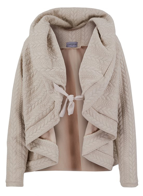 This shawl style cardigan has straight sleeves and is finished with cuff and hem in the same fabric as the main body. The cardigan ties at the front to fasten.