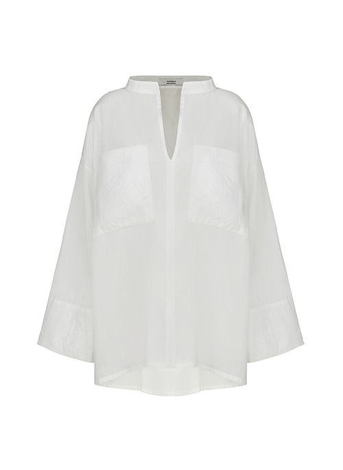 Cut for a loose fit this oversized shirt has elongated relaxed sleeves and a mandarin collar with a V-neckline. It’s decorated with a handcrafted applique on the cuffs and patch pockets. Wear it with our high-waisted tapered trousers for a sleek look.