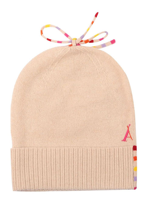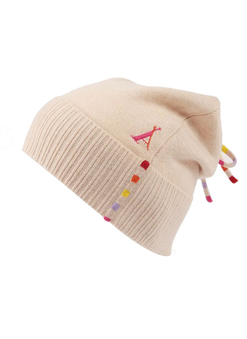 Cashmere wool blend beanie with ribber rollover hem multicolour stripe tape at wearers left and top of beanie which can be untied & fastened onto your wrist or bag strap when unworn to avoid it getting misplaced. Embroidered logo at wearers left.